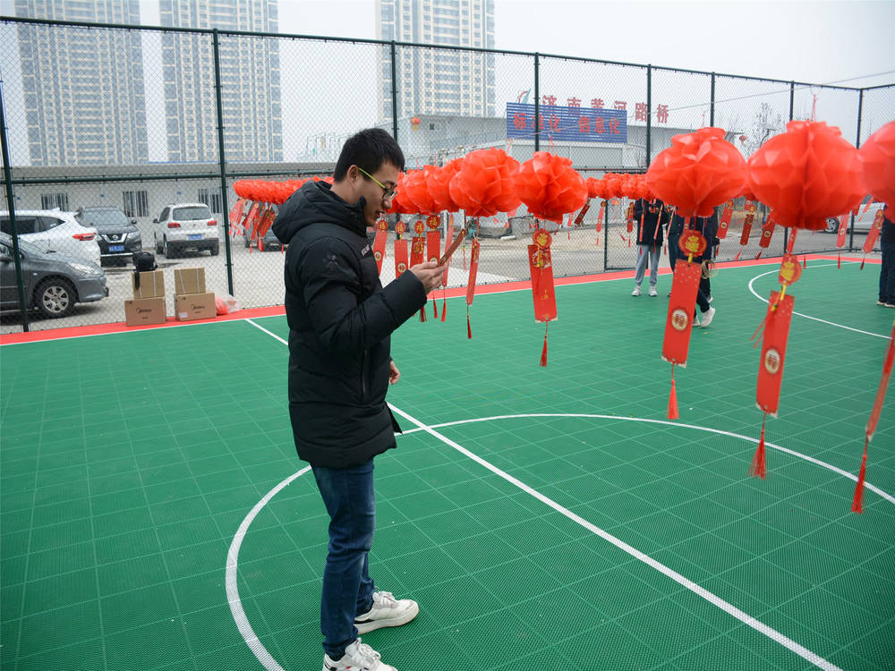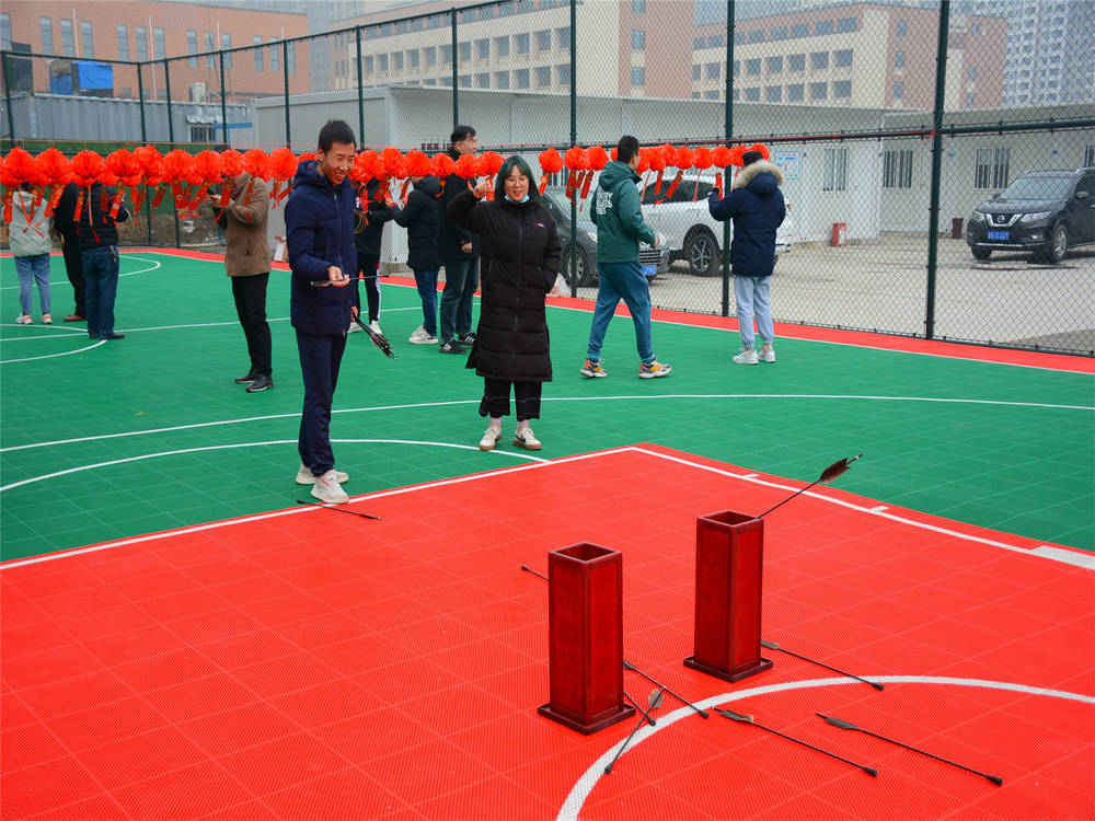 ? 項(xiàng)目部籃球場(chǎng)三排燈籠高掛,200個(gè)燈謎卡與吊穗隨風(fēng)飄動(dòng),黑色箭羽在古紅色的投壺中“張望”,還有那“蠢蠢欲動(dòng)”竹圈,似乎也在等待被人拾起的那一刻。在工作人員介紹完規(guī)則之后,大家爭(zhēng)先恐后地涌入活動(dòng)場(chǎng)地,正式開始了今天的趣味之旅。