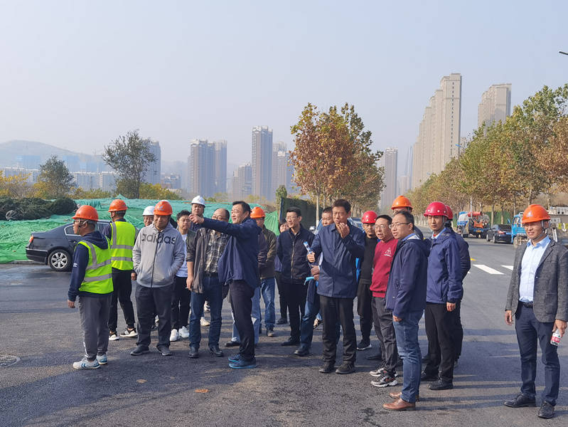 ? 11月14日上午,濟(jì)南市城鄉(xiāng)交通運(yùn)輸局副局長(zhǎng)姜春華、總工程師劉鴻順等一行來(lái)到五分公司承建的青蓮西路工程現(xiàn)場(chǎng),察看工程建設(shè)進(jìn)展情況。集團(tuán)公司黨委副書記、總經(jīng)理謝技勛,副總經(jīng)理、總工程師丁建勇及相關(guān)部室、分公司負(fù)責(zé)人陪同。